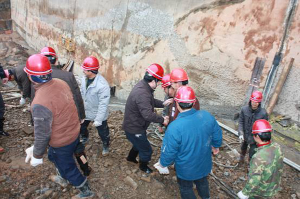 董事長、總經(jīng)理王元旦一行首先來到基坑澆筑、混凝土攪拌站等施工現(xiàn)場進(jìn)行察看,與施工人員一一握手,并聽取了春節(jié)期間帶領(lǐng)員工奮戰(zhàn)在施工一線的公司副總經(jīng)理聶玉和的生產(chǎn)情況匯報。董事長、總經(jīng)理王元旦詳細(xì)詢問了攪拌站的生產(chǎn)能力能否滿足施工要求,工程的進(jìn)展情況及后期施工中的各項措施,對項目部全體員工放棄節(jié)假日搶工期、保質(zhì)量、抓進(jìn)度的奉獻(xiàn)精神給充分肯定和高度評價,他勉勵大家保證質(zhì)量安全的前提下,抓緊時間完成大壩防滲面板的施工、再苦再累也要咬緊牙關(guān)挺過去,并要求施工項目部合理安排好大家春節(jié)期間的工作和生活。