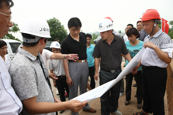 孫曉山廳長一行深入查看了樟山庫區防護工程的施工現場,并認真聽取了我公司項目經理彭紅軍對工程整體布置、進度及工程施工中遇到的困難和問題等的簡要匯報。樟山防護工程施工戰線長、作業難度大、牽涉的范圍點多面廣,是峽江水利樞紐庫區防護工程施工難度最大的項目之一,孫廳長對工程進展情況非常關心。聽取匯報后,孫廳長指出:一是要做好民生工程,做好移民、征地、拆遷等工作,為工程施工提供便利;二是要爭取早日施工,在早稻收割完成后立即進行工程施工,確保工程于明年7月份完成主體工程;三要合理安排施工工期,確保峽江水利樞紐蓄水及第一臺發電機組按期發電。