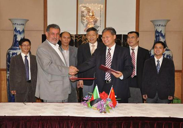 徐飛洪大使(右三)與阿方能源水利部水務(wù)司長(zhǎng)穆罕穆迪(左二)互換移交證書