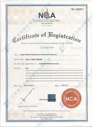 江西省水利水電建設有限公司肯尼亞分公司接到通告后,積極準備相關資料,憑借公司的技術實力和肯尼亞市場的良好業績,最終取得所有六項的一級證書。其中包括:水利施工一級,公路工程施工一級,房屋建筑工程施工一級,結構施工一級,電力工程施工一級和機電工程施工一級,有力地提升公司的品牌影響,提升了公司資信競爭力,為公司在肯尼亞各項工作的全面深入開展創造了積極有利的條件。