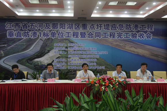 2011年5月8日,我公司承建的江西省五河及鄱陽湖區(qū)重點圩堤應(yīng)急防滲處理工程垂直防滲1標(biāo)單位工程暨合同工程完工驗收會在南昌市召開。省水利廳廳長孫曉山,廳紀委書記李東江,副廳長文林、廳總工張文捷,省發(fā)改委、省財政廳、省水利廳有關(guān)處室及有關(guān)單位負責(zé)人,南昌市水利局等領(lǐng)導(dǎo)出席了會議。