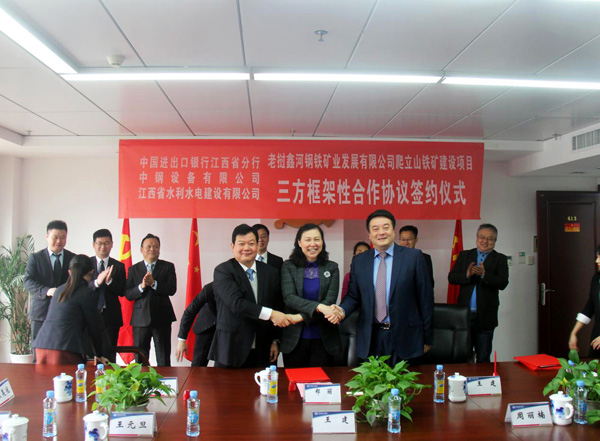 12月29日上午,在江西省商務(wù)廳副廳長(zhǎng)方向軍、外經(jīng)處處長(zhǎng)王健的見證下,公司與中國(guó)進(jìn)出口銀行江西省分行和中鋼設(shè)備有限公司就老撾鑫河鋼鐵礦業(yè)發(fā)展有限公司爬立山鐵礦建設(shè)項(xiàng)目正式簽訂三方框架性合作協(xié)議。中國(guó)進(jìn)出口銀行江西省分行行長(zhǎng)鄭麗、中鋼設(shè)備有限公司總經(jīng)理王建、公司董事長(zhǎng)王元旦、海外公司總經(jīng)理黃鄭民等出席簽約儀式。