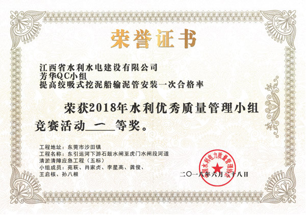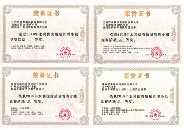 近年來,公司注重質量管理創新,積極開展QC成果和技術攻關活動,工程質量管理水平和企業創新能力不斷提升,已連續四年榮獲水利優秀質量管理小組競賽活動獎項。